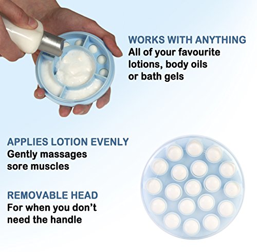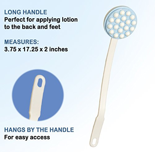 Applies lotion evenly and smoothly while gently massaging sore muscles. The long handle is perfect for applying lotion to the back and feet. Works with any lotion, body oils or bath gels. Measures: 3.75 x 17.25 x 2 inches. Hangs by the handle for easy access.Feature