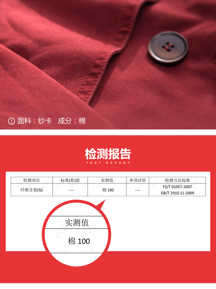 | 面 料:主布:棉 里布:79.3%棉20.7%聚酯纤维颜 色:砖红 |