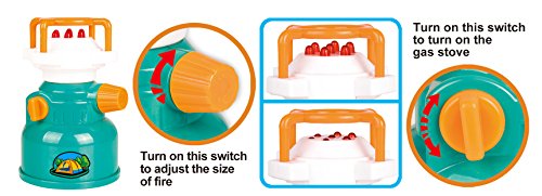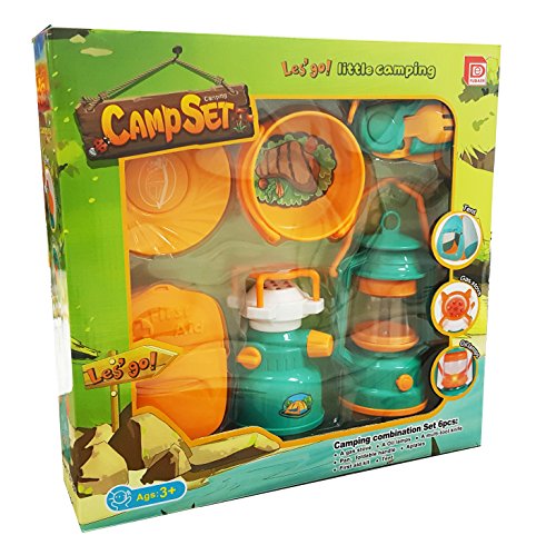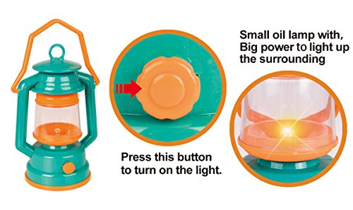 Let's Go Camping! Deluxe Camping Playset with Collapsible Pop Up Play Tent made of Net and Nylon. The play tent is durable, strong, and easy to clean. It can be built up easily with simple twists and pop-ups, or folded down to inch flat. One opening flap for easy entry or exit, while two mesh side windows are built for refreshing air flow during the summer playtime. The play set also includes a gas stove burner with lights and burning sound effects, a battery operated lantern which also illuminate when going into the imaginary dark woods. Accessories include a cooking pot with foldable plastic handles, plate, utility utensil, pretend first aid kit. "AA" Batteries Required (not included). Recommended Ages 3 and Up.Feature