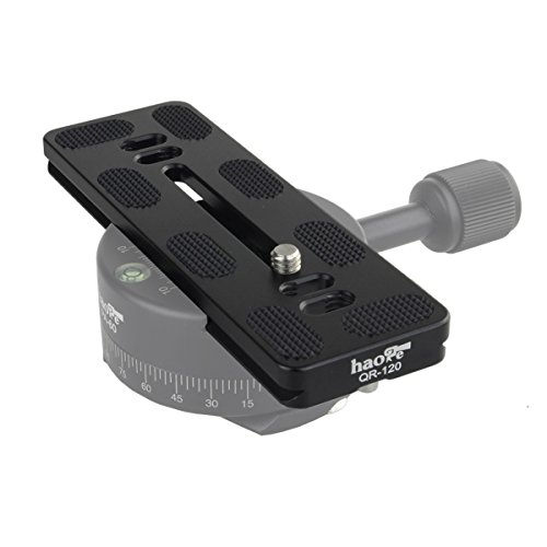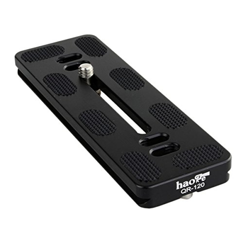 The 120mm slide-in quick release plate has a 1/4"-20 connecting screw and two safety stop screws for Cameras, Ballheads, Panorama Head and other Arca-Swiss compatible Quick Release clamps.