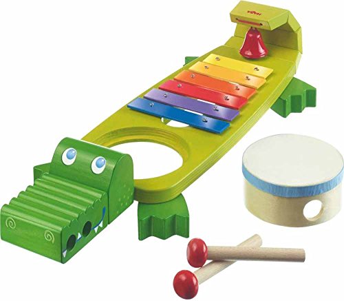 Let your toddler rock and roll with this whimsical crocodile-shaped musical instrument set! Includes a drum, metallophone (or xylopnone), guiro wooden block, and bell. Set contains 2 mallets for playtime duets. Fosters brain development, encourages a sense of rhthym, and hones small motor skills. This croc's whimsical design and playful expression make music time fun!