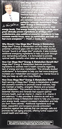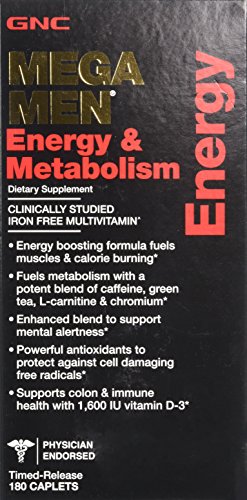 -. Binding : Health and Beauty -. Brand : GNC -. Feature : With 1,600 IU of vitamin D-3 for colon health and immune support / Boosts energy and metabolism / Supports mental focus / Calorie burning support -. Label : GNC -. Manufacturer : GNC -. PackageQuantity : 1 -. ProductGroup : Health and Beauty -. ProductTypeName : HEALTH_PERSONAL_CARE -. Publisher : GNC -. Studio : GNC -. Title : GNC Mega Men Energy & Metabolism - 90 & 180 Capsules Bottles Mega Men® Energy & Metabolism 2X MORE D-3 Dietary Supplement Clinically Studied Multivitamin With 1,600 IU of Vitamin D-3 for colon health and immune support ? Boosts energy and metabolism Supports mental focus Calorie burning support