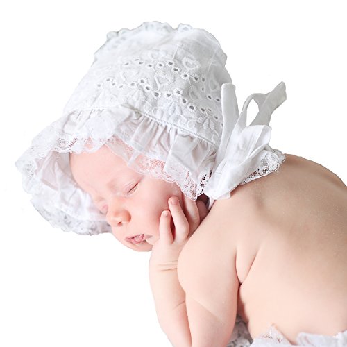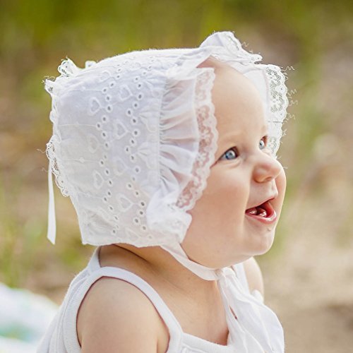 Binding : Apparel Product Description Lovely classic styled baby bonnet is made in white all cotton eyelet fabric that is embroidered with hearts. How to measure your baby for our bonnets Bonnets are measured from bottom front of the bonnet - around the top of the head, and down to the other bottom side. Size - Measurement 0-3 months - 10.25" 3-6 months - 11.75" 6-12 months - 13.5" 12-18 months - 15" 18-24 months - 16.5"