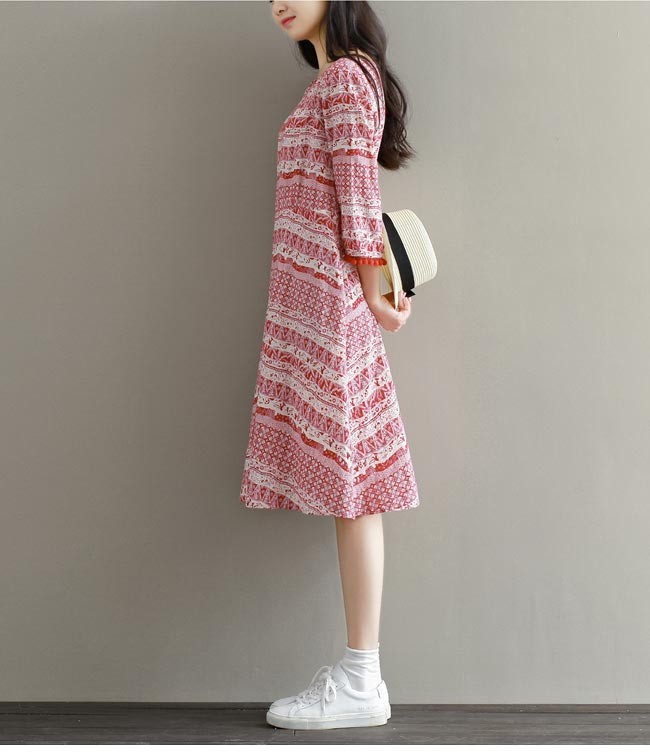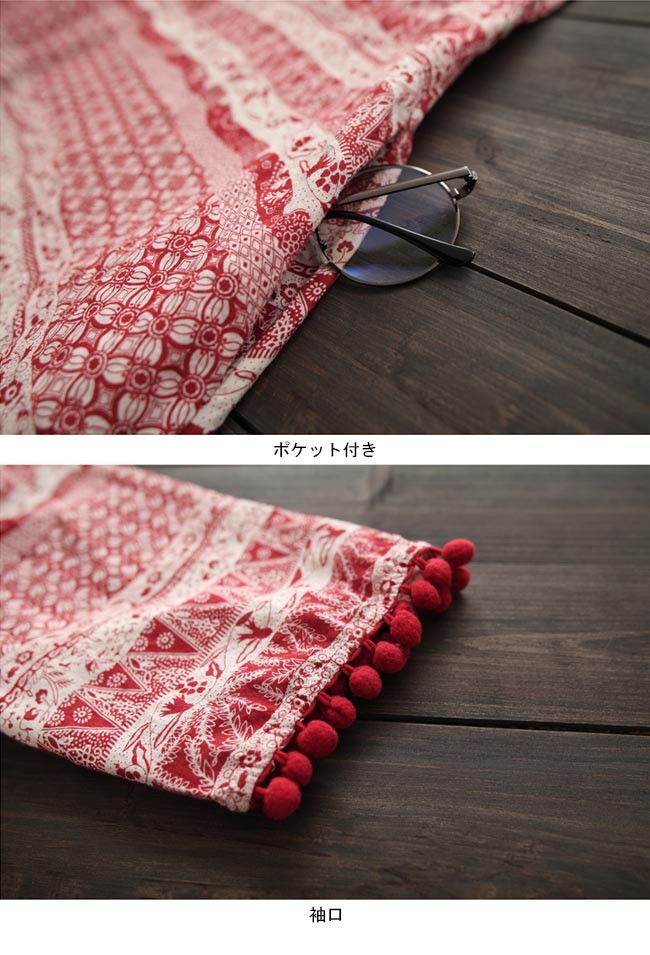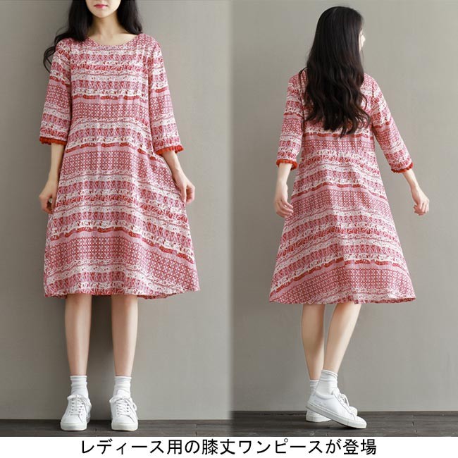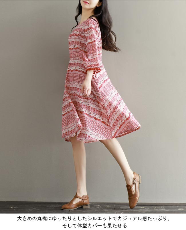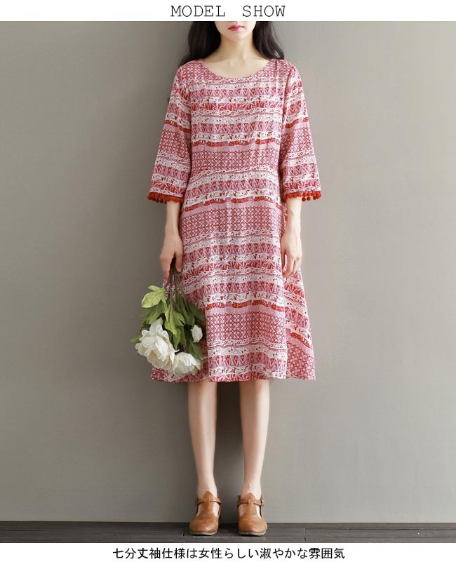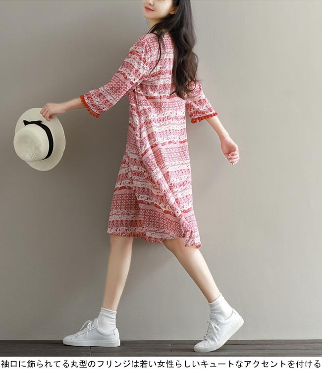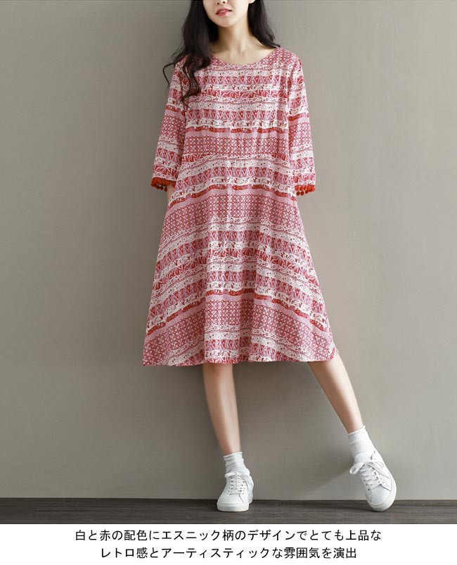 ワンピース 七分丈袖 体型カバー エスニック柄 レディース 膝丈ワンピース ゆったり Aライン 女性用 七分丈袖ワンピース 夏物 春秋物レディース用の膝丈ワンピースが登場七分丈袖仕様は女性らしい淑やかな雰囲気白と赤の配色にエスニック柄のデザインでとても上品なレトロ感とアーティスティックな雰囲気を演出袖口に飾られてる丸型のフリンジは若い女性らしいキュートなアクセントを付ける大きめの丸襟にゆったりとしたシルエットでカジュアル感たっぷり、そして体型カバーも果たせるカラー:写真色素材 綿混紡サイズ(cm) M L XL 2XLM バスト92 総丈97 肩幅37L バスト96 総丈98 肩幅38XL バスト100 総丈99 肩幅392XL バスト104 総丈100 肩幅40ご注意:※サイズは平置きサイズです。素人採寸ですので、若干の誤差がございます、ご了承ください。