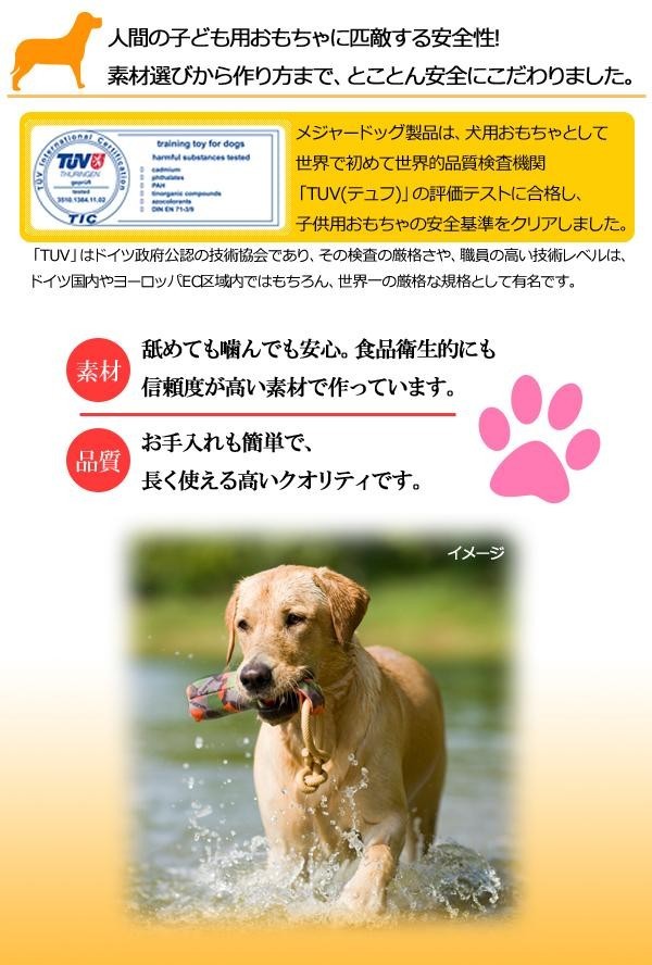 | 素材は耐久性が高く、ワンちゃんが噛んでも安心・安全なものを使用しています。ワンちゃんが長く楽しめるよう様々な工夫がなされているおもちゃです♪そのクオリティの高さは、ドッグトレーナーも愛用している程です! |