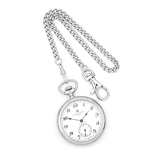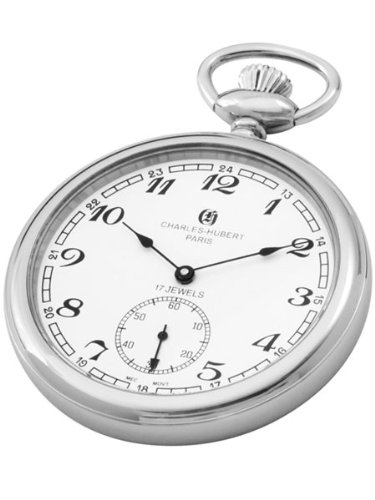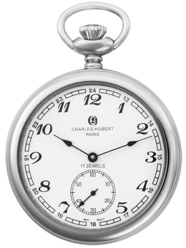 Amazon.com Offering the convenience of 24-hour time-keeping and an engravable cover, the Charles-Hubert, Paris Open Face Mechanical Pocket Watch #3756-WA has a streamlined, classic design with white dial, black-tone Arabic numeral hour markers and hands, and a seconds subdial. Seventeen-jewel mechanical movement offers traditional appeal, while stainless steel construction lends both polish and durability. This Charles-Hubert original arrives in a deluxe blue giftbox with stainless steel curb chain. 0