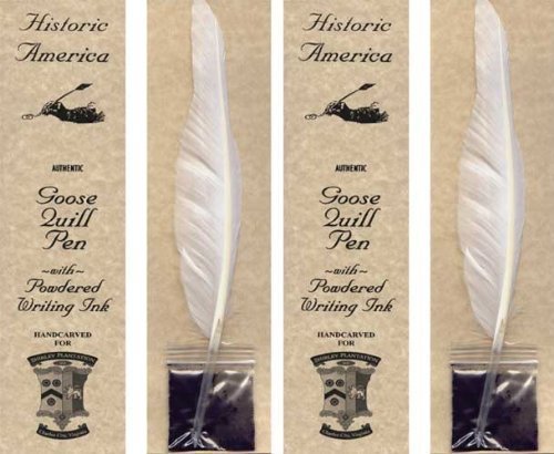Re-enact history with this hand-carved goose quill pen. Includes brochure on heavy parchment paper and a packet of powdered ink, just like Lewis and Clark carried with them on their cross-country trek to the Pacific Ocean. Just add water to make ink. This is the real thing, the same kind of pen used to sign the Declaration of Independence and other historic documents, and it will make a great hands-on history lesson that your children won't forget!