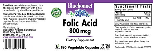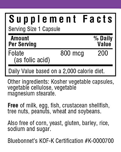 Bluebonnet's Folic Acid 800 mcg Capsules contain pure folate in its crystalline form. Available in easy-to-swallow vegetable capsules for maximum assimilation and absorption.