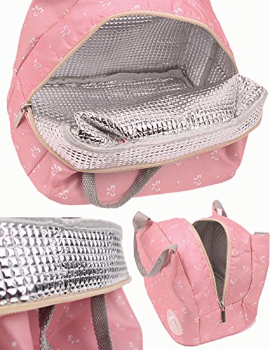 one main pack with laptop compartment, two sides pockets, one front pocket. Can fit 14 inch Laptop; Lightweight lunch bag with zip closure is easy to carry with comfort-grip handle; insulated to keep food fresher longer; it is perfect for lunch or snacks at school or traveling