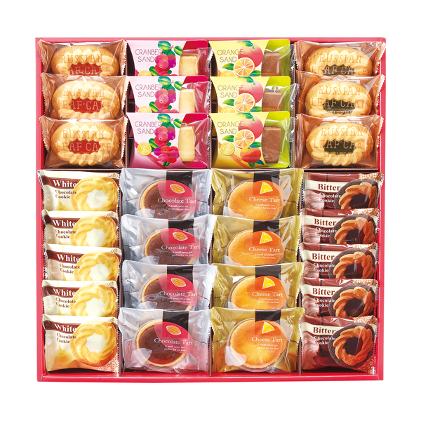 ●ロシアリーフケーキ(ストロベリー・キウイフルーツ×各3)、オレンジサンド・クランベリーサンド×各3、ホワイトチョコレートクッキー・ビターチョコレートクッキー×各5、チョコレートタルト・チーズタルト×各4