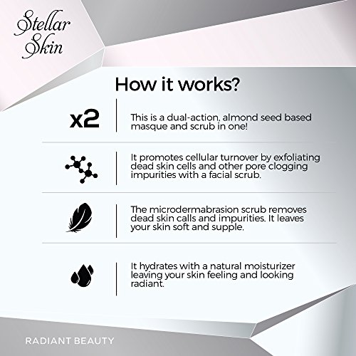 TWO SKIN CARE TREATMENTS FOR THE PRICE OF ONE: Facial Scrub and Mud Mask in a dual purpose formula. The perfect microderabrasion mud mask and beauty product for your skin care. Get spa quality luxury without spending a fortune and get spa results right at home! This incredible mask includes unique ingredients and minerals like almond seed. Use this special mask on both your face and body. Give yourself a spa pampering! The best facial mask for radiant beauty.