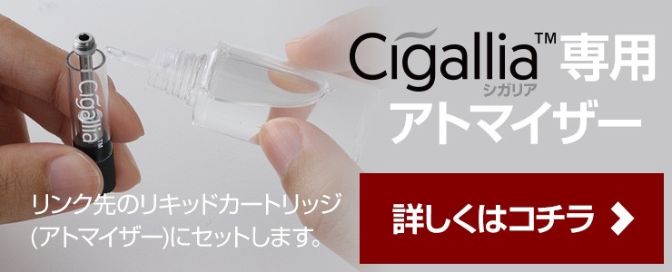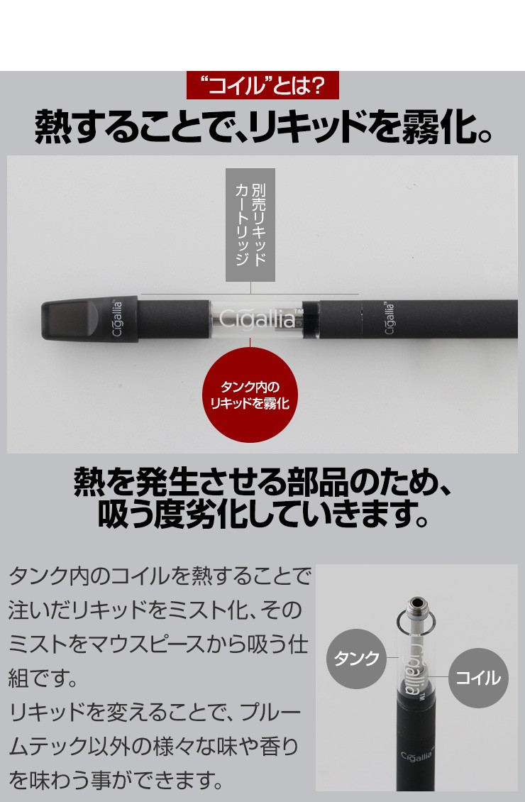 | ご注意事項 | シガリアとの接続箇所内部にはコイルが内蔵されており、そのコイルでリキッドを加熱し気化したミストを吸うことができます。そのため、リキッドを入れて接続直後は気化が足りずに、十分なミストが出ません。はじめてリキッドを入れる時は、20〜30分ほど時間を置き、リキッドが馴染んだあとで吸引をお願いします。 ※コイルのネジ先端に穴が空いていますが、ここにリキッドを入れると故障の原因となります。 ※逆さまの状態で使用すると、コイルが空焼きになり故障の原因となりますのでご注意ください。 ※取扱説明書をよくお読みになりご使用ください。 |