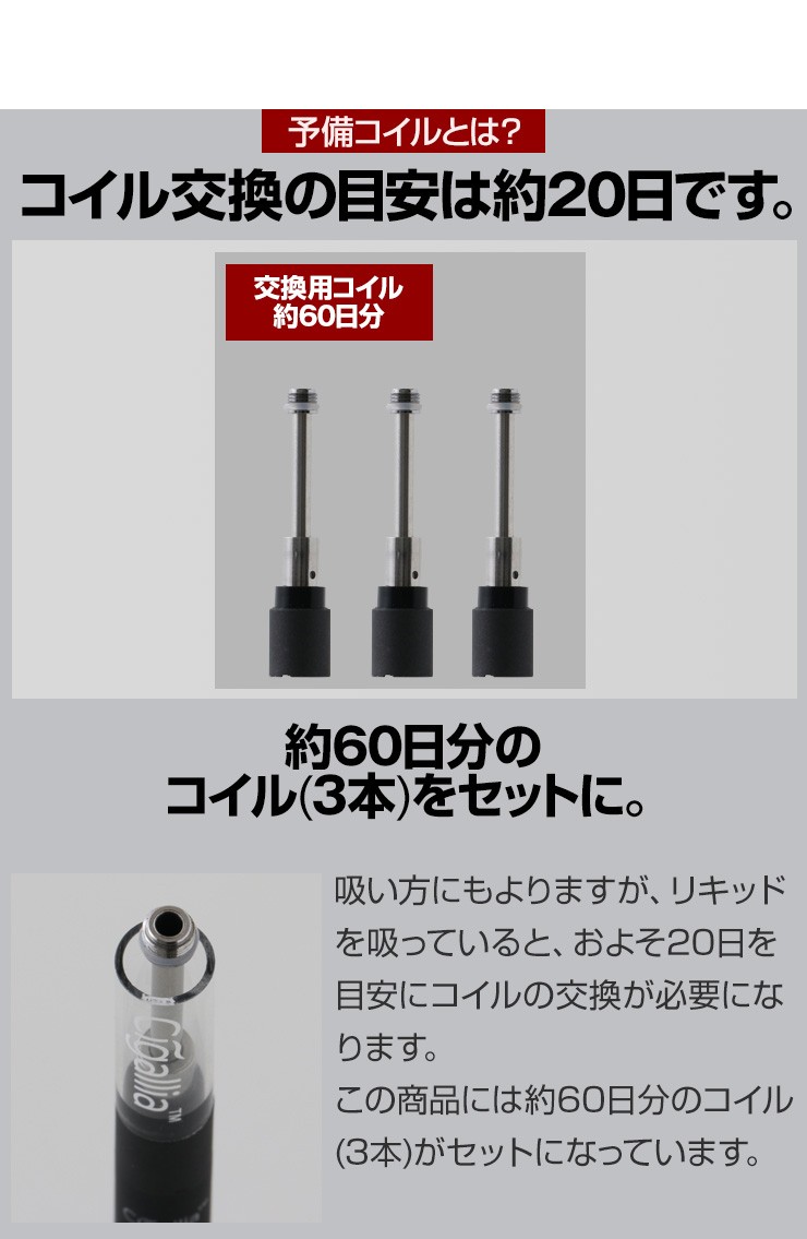 別売のシガリア専用アトマイザーに組み込んで使う交換コイル3本組です。【特徴】●およそ60日分リキッドが吸えるコイルです。デジキン