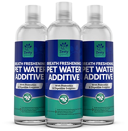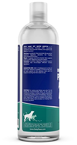 -. Feature : MINTY FRESH BREATH - Unlike a toothbrush or a mouthwash rinse that make pets feel uncomfortable, Pet Water Additive is a hassle-free 3-in-1 solution to freshen breath, boost digestive health, and support joint function. / ORAL HYGIENE MADE EASY - This formula features Aloe Vera that may reduce the appearance of plaque and tartar to give teeth a clean and healthy look, and features a spearmint flavor to get rid of odors. Simply pour a few drops into a water bowl. / LOADED WITH DIGESTIVE ENZYMES - If your canine or feline friend needs a sip of water after food for dinner, add some Pet Water Additive for digestive support, as Bromelain and Papain to help to break down foods and increase nutrient uptake. / JOINT & PREBIOTIC SUPPORT FOR GUT HEALTH - The Aloe Vera found in Zesty Paws Pet Water Additive is a natural prebiotic source that promotes healthy bacteria that encourages proper digestion so gas and constipation are far less frequent. / A PET SUPPLEMENT YOU CAN TRUST - Zesty Paws understands how much your pet's wellness means to you, so they manufacture their Pet Water Additive in FDA-registered facilities that are NSF and GMP-certified in the USA.