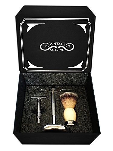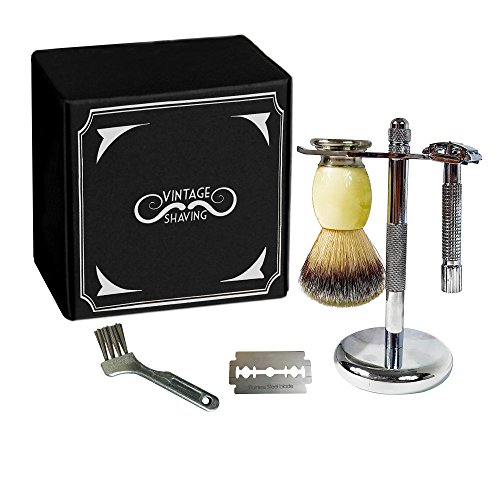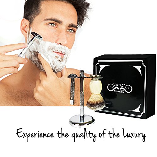 Wet Shave Kit For Men | Complete Old Fashioned Shaving Set | Luxurious Badger Soap Brush | Stainless Steel Safety Razor|Blade | Cleaning Brush | With...