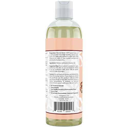 Beauty Aura Castor Oil is 100% Natural amd Cold Pressed from finest quality Castor seeds sustainably sourced from Organic farms in India and processed in a GMP certified facility. Bottled in USA