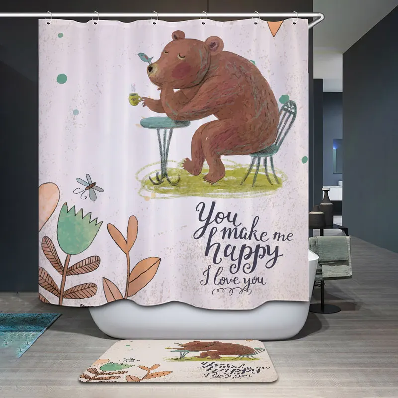 Pattern/Shapes:Cartoon Animals Cute Bear With Plant and Letters Shower Curtain