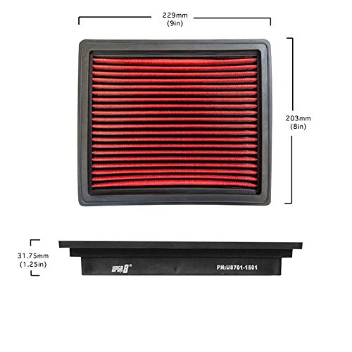 -. Binding : Automotive -. Brand : UPGR8 -. Color : Red -. EAN : 0849250007205 -. Feature : UPGR8 engine air filter is designed to fit perfectly in your stock airbox / Made of high density acrylic fiber, black rubber and double black reinforced stainless steel mesh / It is engineered to maximize air flow performance / Allows more air to flow easily to the engine, it will increase more horsepower and torque / This panel air filter is long life type filter and it is reuseable -. IsAutographed : 0 -. IsMemorabilia : 0 -. Label : UPGR8 -. Manufacturer : UPGR8 -. ManufacturerPartsWarrantyDescription : Parts -. Model : U8701-1501 -. MPN : U8701-1501 -. PackageQuantity : 1 -. PartNumber : U8701-1501 -. ProductGroup : Automotive Parts and Accessories -. ProductTypeName : AUTO_PART -. Publisher : UPGR8 -. Studio : UPGR8 -. Title : Upgr8 U8701-1501 Hd PRO Replacement High Performance Dry Drop-in Panel Air Filter Red -. UPC : 849250007205