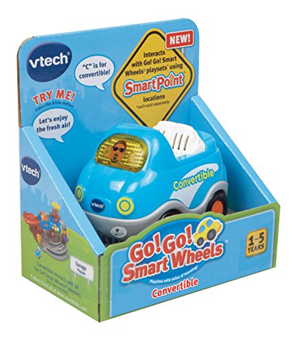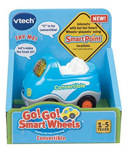 -. Binding : Toy -. Brand : VTech -. EAN : 0885656652038 -. Feature : Cruise into the learning zone with Go! Go! Smart Wheels Convertible; educational toy teaches the letter "C" and the vehicle name while encouraging pretend play / Play car features VTech SmartPoint technology that responds to VTech SmartPoint locations across the different Go! Go! Smart Wheels playsets / Includes 3 sing along melodies and unique educational phrases and sounds; light-up driver button activates learning, music, and sounds / Perfectly sized toy car for little hands features auto power-off that saves batteries; meant for kids and toddlers 1 to 5 years old / The convertible is not motorized and must be pushed; lights and sounds operate on 2 AAA batteries included for demo, use new batteries for regular use -. IsAdultProduct : 0 -. ItemPartNumber : 80-152000 -. Label : VTech -. Manufacturer : VTech -. Model : 80-152000 -. MPN : 80-152000 -. PackageQuantity : 1 -. PartNumber : 80-152000 -. ProductGroup : Toy -. ProductTypeName : TOYS_AND_GAMES -. Publisher : VTech -. Studio : VTech -. Title : VTech Go! Go! Smart Wheels Convertible -. UPC : 100029599841 -. Warranty : 90 day warranty against manufacturer defects