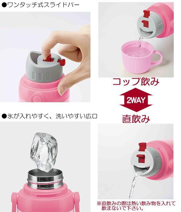直接口を付けて飲める水筒としても、コップに入れて飲める水筒としても使える2WAYのステンレスボトルです。氷を入れやすい広口タイプで、ワンタッチ式のスライドバーで飲み方をお選びいただけます。 |