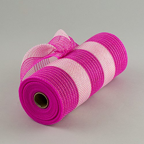 - A roll of mesh with an ivory and dark pink stripe pattern in a combination of synthetic fibers and natural jute fibers woven together. This style of blended poly and jute burlap deco mesh combines the look of traditional burlap with the durability of a synthetic mesh weave. Roll is 10.5" wide by 10 yards or 30 feet long. Available in additional widths and colors. Great pink color with natural texture.