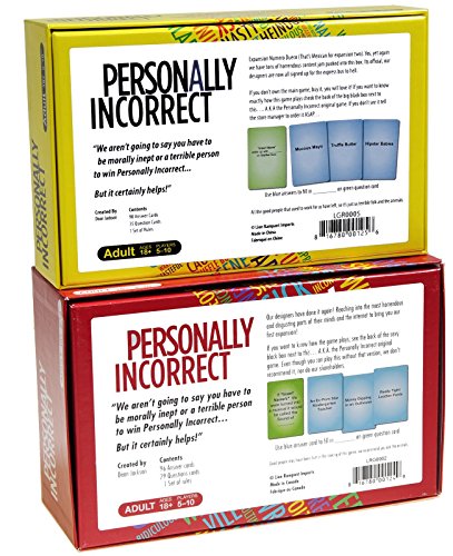 -. Binding : Misc. -. Brand : Deluxe Games and Puzzles -. EAN : 0703546238455 -. Feature : Expansions Cards for Personally Incorrect Game. Includes Red Box #1 and Yellow Box #2. Bundled Items. / Best when used with Personally Incorrect Game. (however can be used stand alone.) / For ages 21 and older. Very much an adult themed game !!!!! Most appropriately inappropriate answer wins the round. / Expansions #1 includes: 96 Answer Cards, 29 Question Cards, Game Rules. Expansion #2 90 Answer Cards, 35 Question Cards, Game Rules. / Bonus Black Mesh / Red Nylon combo design Drawstring Game (or utility) Carry Bag -. IsAdultProduct : 0 -. Label : Deluxe Games and Puzzles -. Manufacturer : Deluxe Games and Puzzles -. MPN : LRG02EXP_BUN2 -. PartNumber : LRG02EXP_BUN2 -. ProductGroup : Sports -. ProductTypeName : SPORTING_GOODS -. Publisher : Deluxe Games and Puzzles -. Studio : Deluxe Games and Puzzles -. Title : Personally Incorrect Expansion #1 (Red) and Expansion #2 (Yellow) _ Bonus Black Mesh/Red Nylon Drawstring Bag _ Bundled Items -. UPC : 703546238455