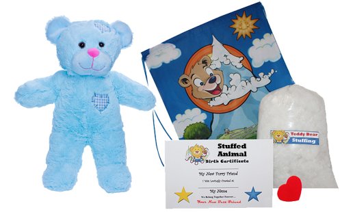 -. Feature : 15 inch Plush Baby Blue Patch Bear / Plush Animal Skin, Bag of Fluff Stuffing, Fabric Wishing Heart Insert, Birth Certificate, Super Cute Nylon String Bag Backpack / Easy Instructions, No Sewing Required, Self Sealing Closure, Super Soft Feel / Fits most 14 - 18 inch stuffed animal clothing and accessories. / Closure big enough for sound module insert or record your own sound module.