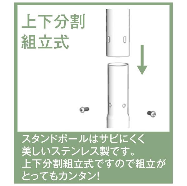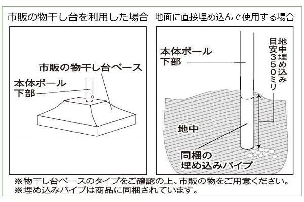 ポスト底面・背面のどちらにも取り付け可能な、自立・埋込兼用スタンドポールです。市販の物干し台ベースを利用して自立させる方法と、地面に直接埋め込んで使用する方法、どちらでもお使いいただけます!! |