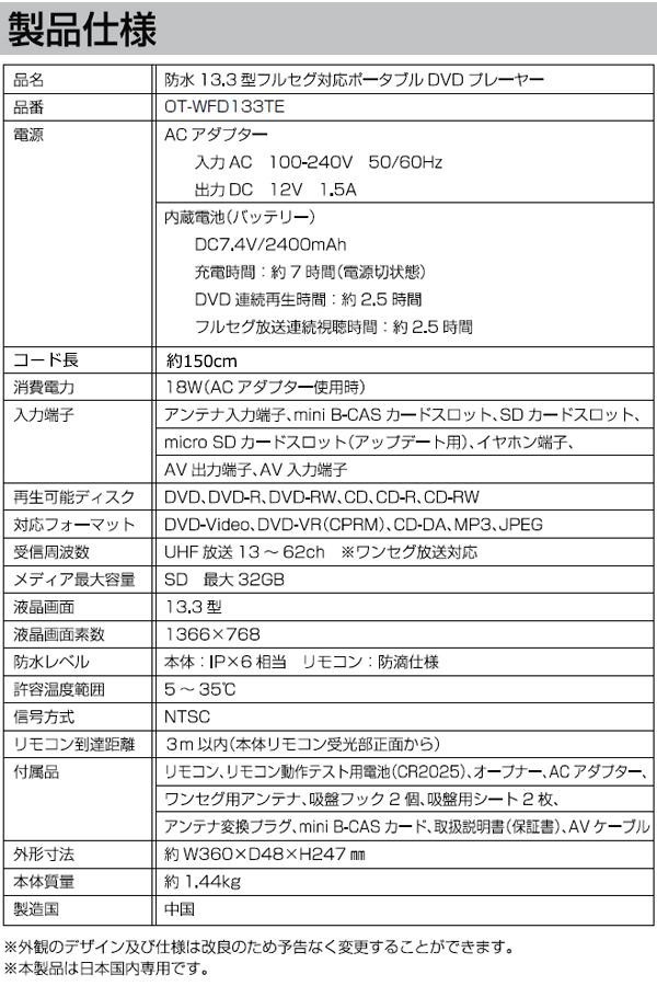 fk094igrjs防水仕様のポータブルDVDプレーヤーですACアダプター、バッテリーの2電源対応で持ち運び可能フルセグ&ワンセグ対応なのでテレビも楽しめます サイズ 個装サイズ:46×9×28cm 重量 個装重量:2300g 製造国 中国 フルセグ対応の防水DVDプレーヤー 防水仕様のポータブルDVDプレーヤーですACアダプター、バッテリーの2電源対応で持ち運び可能フルセグ&ワンセグ対応なのでテレビも楽しめます