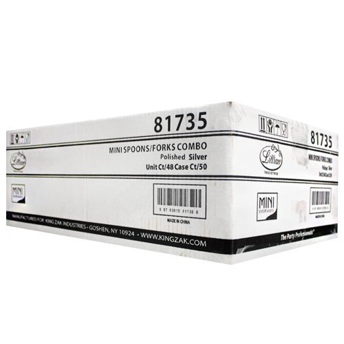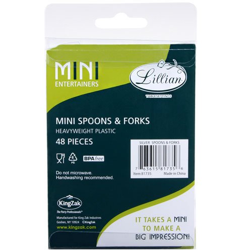 Studio : King Zak Industries, Inc. Publisher : King Zak Industries, Inc. Binding : Kitchen Product Description Lillian Mini Polished Silver Fork and Spoon Combo, 48 Pieces. Also comes in clear combo (80235). Fork (81738, 80238) and Spoon (81739, 80239) also sold separately in Clear and Polished Silver. BPA Free. Designed for all occasions, banquets, parties, upscale catering and home. Disposable. 0