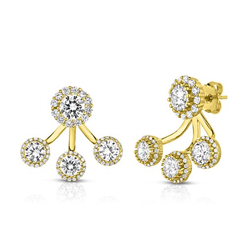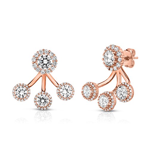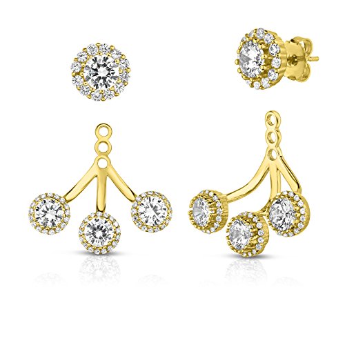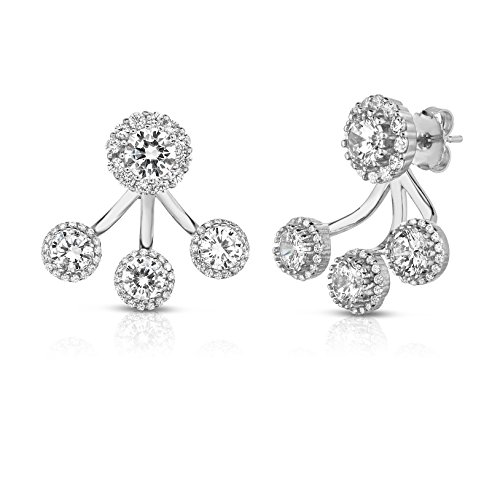 Our front to back 2 in 1 earring set has an edgy and modern look and made from sterling silver with a high shine finish. This set can be either worn together or separately; a cubic zirconia stud enhanced by a halo and a row of 3 lustrous cubic zirconia stones, also enhanced by a halo, along your ear lobe. This design gives a modern vibe to formal stud earrings. Be prepared to amaze and impress with this new twist.Feature
