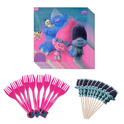 -. Feature : This party pack for trolls is perfect for a child's birthday party or trolls party. / (1) Trolls - Table Cover ,(1) Trolls Banner / (10) Trolls plastic Fork - (10) Dessert plates / (10) Trolls - Lunch Napkins,(10) Trolls - 9 oz Cups / (10) Trolls Cake Topper
