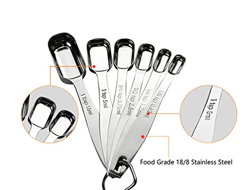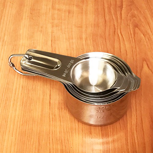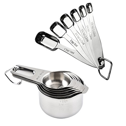 Variety of Sizes:7 Measuring Cups:1/8(Coffee Scoop Size),1/4,1/3,1/2,2/3,3/4,1 cup;6 Measuring Spoons:1/8,1/4,1/2,3/4,1 tsp,1 tbsp–The measuring spoons are shaped perfectly to fit into even those small spice jars!Perfect for all your measuring needs.