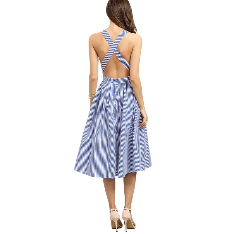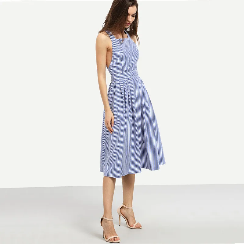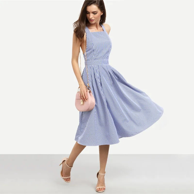 SheIn Women New Arrival Sexy Midi Dresses Summer Blue Striped Square Neck Sleeveless Crisscross Back A Line Dress
