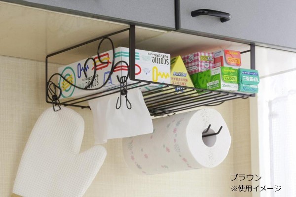 ラップやホイルなど、ストックスペースに最適!!ピンチ2個付きなのでレシピやメモが挟めます。 製造国:日本 素材・材質:スチール(メラミン樹脂焼付塗装) 商品サイズ:幅31.5×奥31×高17cm 重量:780g 仕様:完成品耐荷重:3kg(全体) ※サプライヤー直送品  ご注文後2~3営業日後の出荷となります【商品名】吊り戸棚下シリーズ 吊り下げラック ブラウン・25220