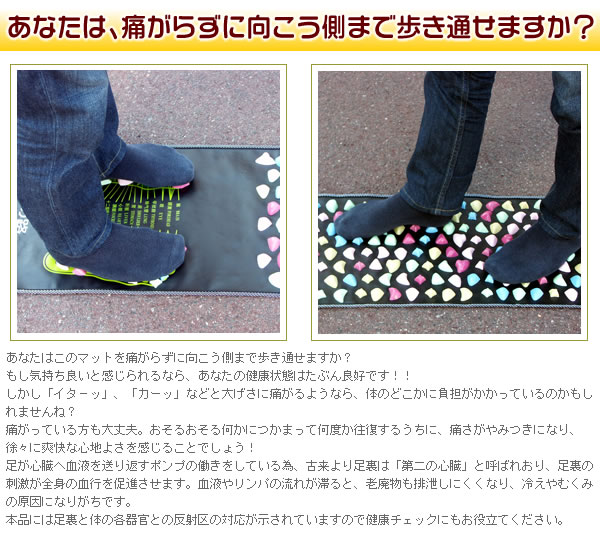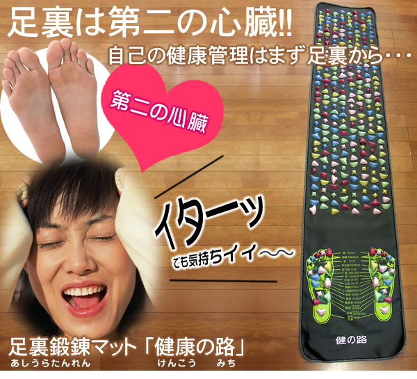 あなたは痛がらずに向こう側まで歩き通せますか?足裏は昔から第二の心臓と呼ばれています。足裏鍛錬マット 「健康の路」を自己の健康管理にお役立て下さい。この痛さはクセになるかも?