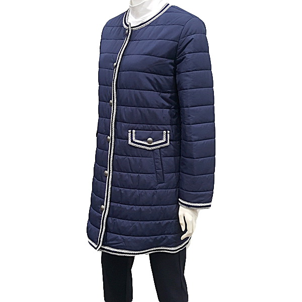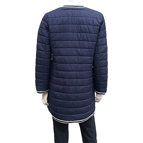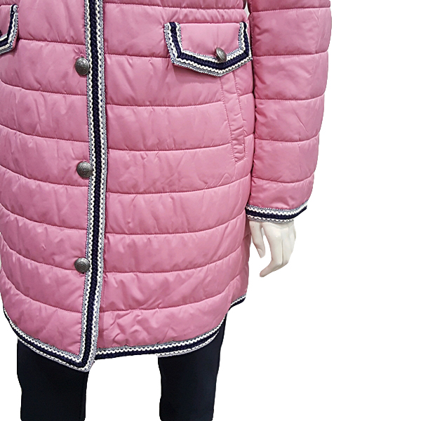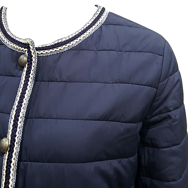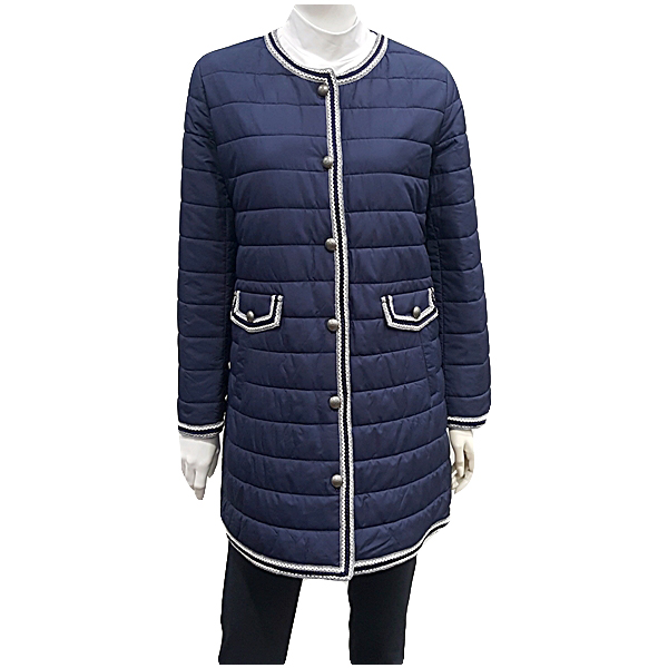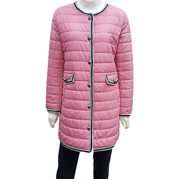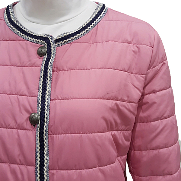 경량 소재에 패딩을 활용한 라운드넥 토퍼로 쟈가드 테이프로 디자인 포인트를 줌