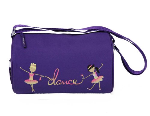 -. Feature : A vivid purple dance duffel with a cute, bright dance design screen P.R.Int on one side of the bag. / Full zipper closure. Full purple lining. Adjustable-length strap. / One zippered end pocket. No interior pockets. / Small, 10" x 6.5" in diameter. Material: microfiber. / Recommended ages 3 to 8 years for carrying just the basics: flats, leotard, and tights.