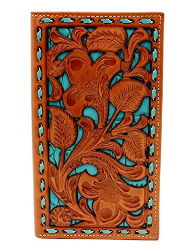 Studio : Nocona Publisher : Nocona Product Description Mens Nocona Wallet: Mens Nocona Western Wallet. This men's Nocona leather rodeo wallet by MF Western Products features a tan floral embossed piercing with a turquoise underlay. The edges have a matching turquoise buck lacing, and white contrast stitching. Inside features a clear ID slot, credit card slots, removable photo slip, checkbook and money slot. This quality wallet will keep your money safe and in style. Measures 6-3/4" x 3-3/4". N5417933 0