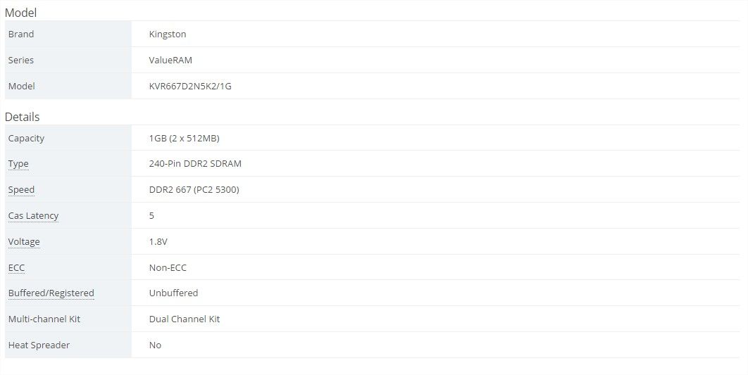 • 1 x Kingston 1GB (KIT) DDR2 667MHZ Desktop PC RAM PC2-5300 (512MB x 2) Dual Channel KIT of 2 - KVR667D2N5K2/1G