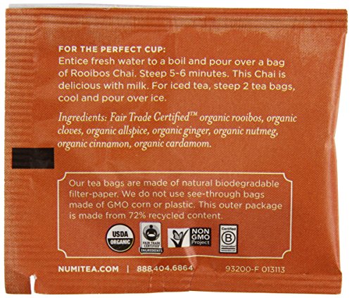 Numi’s organic, caffeine-free Chai blends rich Rooibos and a sultry blend of spices. Piquant cloves, nutmeg, and cinnamon mingle with sweet allspice, vivacious ginger and a kiss of cardamom. Rooibos Chai is great with milk! In the Cedarburg Mountains of South Africa, Rooibos farmers have used revenue from Fair Trade sales to support local schools, gender equality and HIV-Aids prevention. Numi is a labor of love by a brother and sister. She is the artist and he is the alchemist behind all of Numi’s blends. Their exceptional-tasting teas are captured in unique blends that use the highest quality organic, non-GMO ingredients sourced directly from fair labor gardens. Numi combines premium full-leaf quality teas and herbs with only 100% real fruits, flowers and spices. About Numi: Numi is a labor of love by a brother and sister. She is the artist and he is the alchemist behind all of Numi’s blends. Their exceptional-tasting teas are captured in unique blends that use the highest quality organic, non-GMO ingredients sourced directly from Fair Trade Certified gardens. Numi combines premium full-leaf quality teas and herbs with only 100% real fruits, flowers and spices. “Through authenticity, creativity, and commitment to people and planet, Numi brings you the purest, best tasting organic tea”Feature
