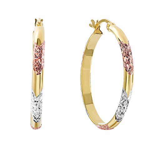Expertly crafted from .925 sterling silver, these hoop earrings are plated with yellow gold and feature diamond-cut pattern panels in rose and white tones