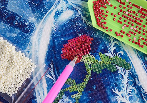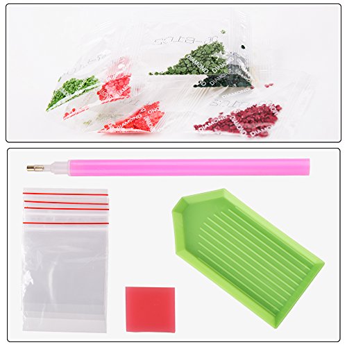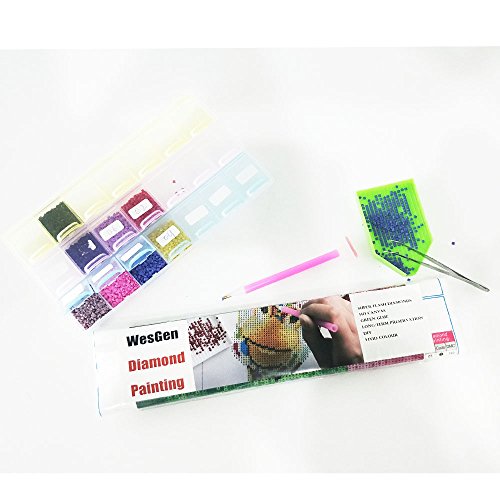 - DIAMOND PAINTING KIT ITEM INCLUDES : Embroidered cloth, point drill pen , gule, plastic tray , 9 bags round resin rhinestone diamond