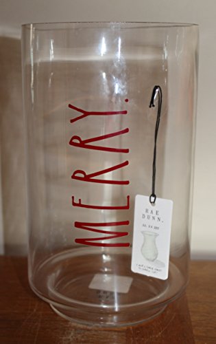 Rae Dunn MERRY in large Christmas Red letters Clear Glass Pillar Hurricane Candle holder 10 X 6 inches. By Magenta.