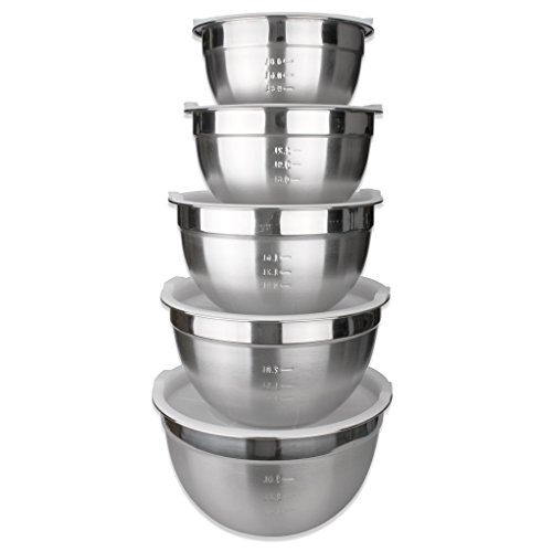 - An elegant 5 piece set of stainless steel mixing bowls with plastic lids.