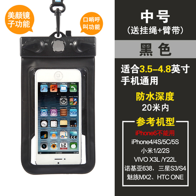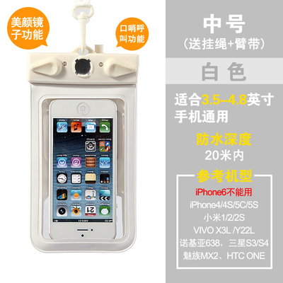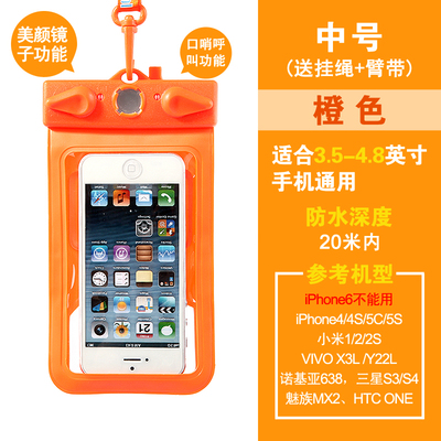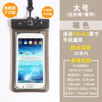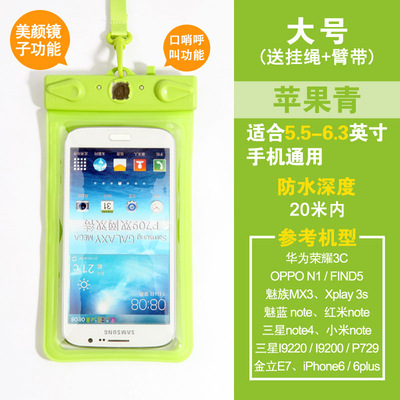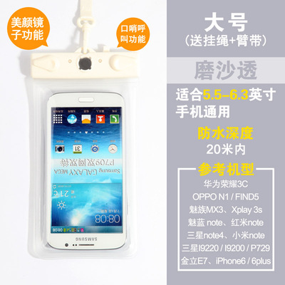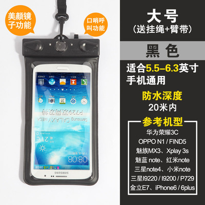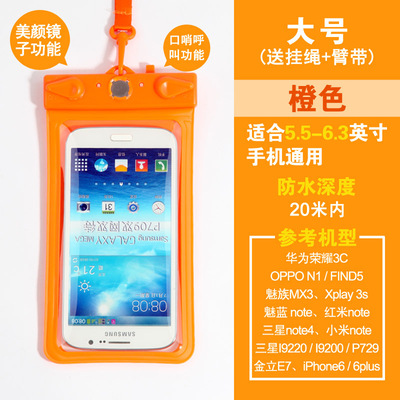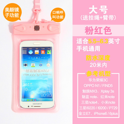 Fit 5.5 inch to 6.3-inch large-screen smart touch screen mobile phone General: Samsung Galaxy, Mega 6.3, OPPO N1 This model is suitable various operations from 5.5 to 6.3 inch mobile phone use, can be used for swimming, diving, water parks, beach play, such as summer, outdoor waterproof, does not affect the phone, listen to music, send messages, touch screen, etc. are not influence, very practical, is essential for outdoor play in the water baby, stable quality, but also when the family over the remote control waterproof jacket, usually to protect the use of the remote control at the home, etc., can be used both inside and outside, a good deal. Quickly to start it, the pro! Name: Multifunctional Mobile Waterproof Bag Weight: 61G (without packaging) Effective space: length 17cm * Width 10cm * * material thickness 0.035cm Model: T-11D Uses: For 5-inch to 6.3-inch phone water photography, use whistles when the water distress call and mirrors attract lifeguard flash support. Material: high quality PVC Water depth: within 20 meters belong to a safe area. Model using renderings enjoy