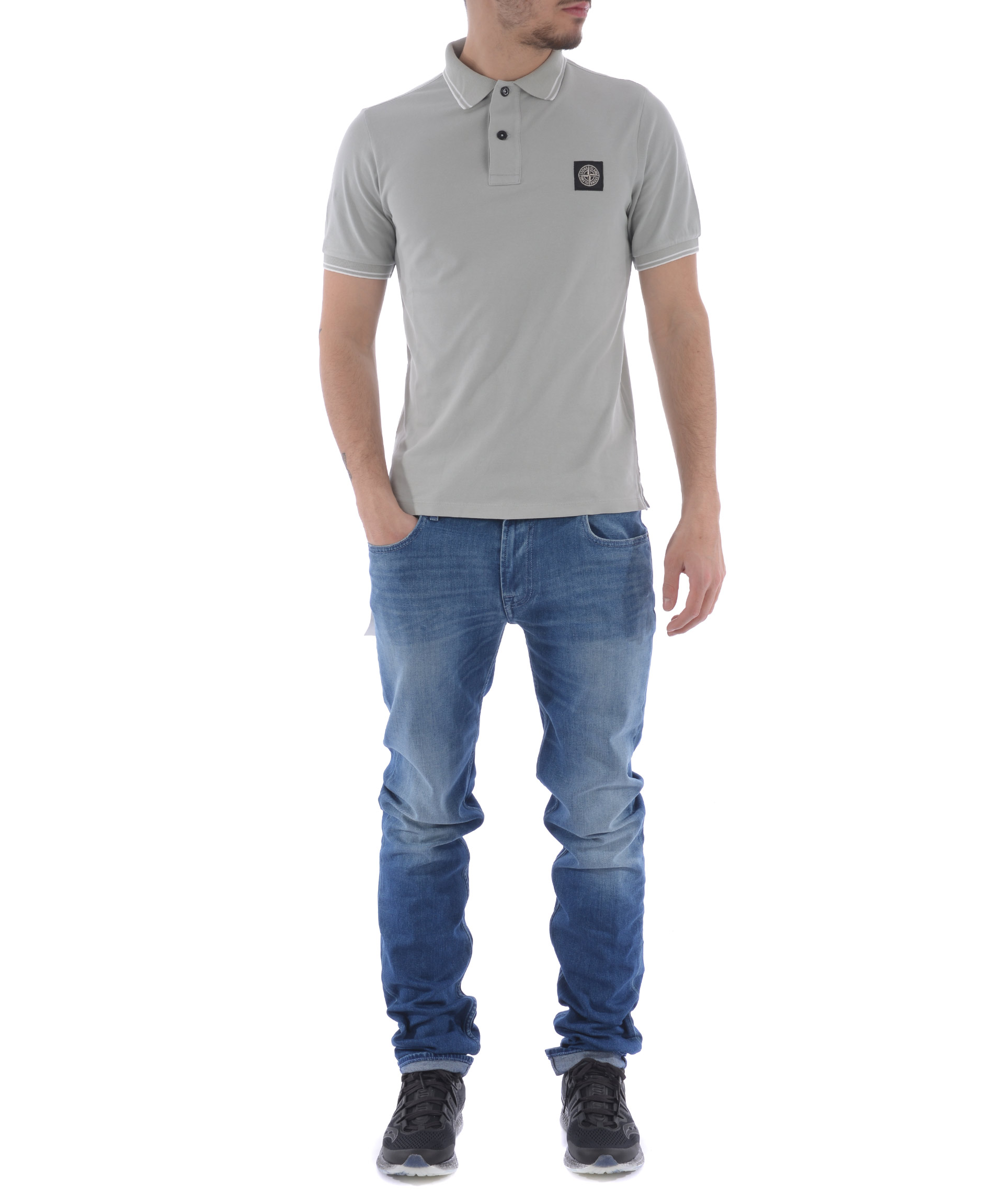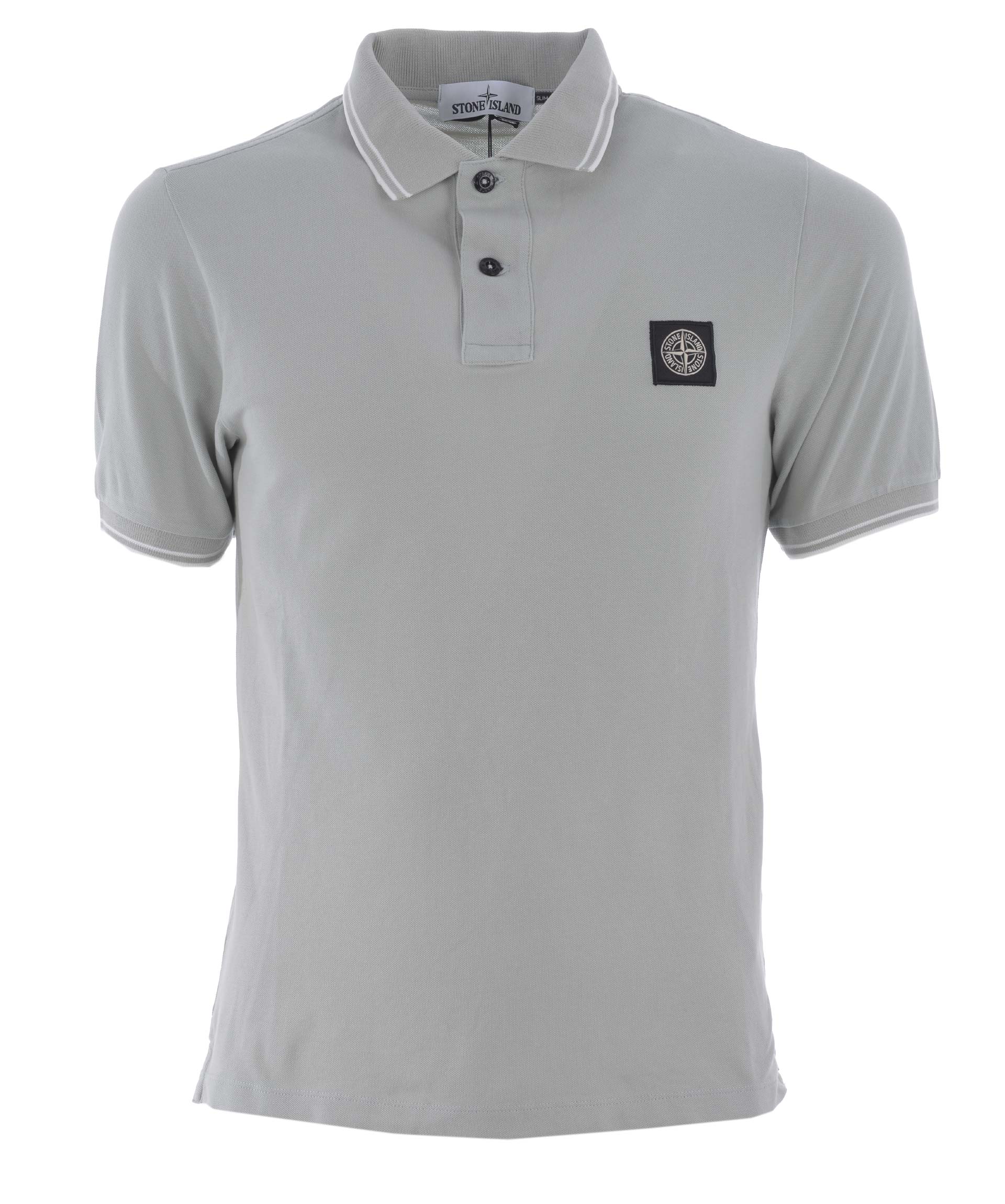 Polo Stone Island in piquet stretch Grigio perla. Colletto a costine con profili a contrasto. Apertura a 2 bottoni. Manica corta con bordo a costine e profili a contrasto. Patch logo frontale. Slim fit. Misura in foto S 95% cotone, 5% elastene