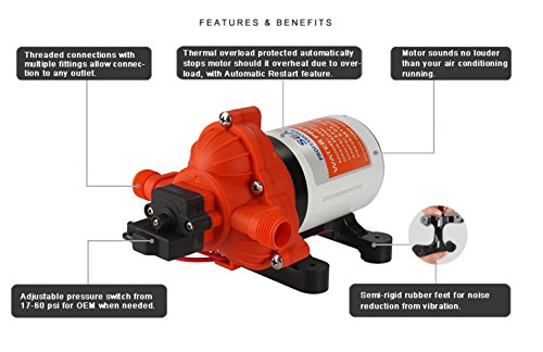 -. Feature : 4 Year Warranty comes standard on all Seaflo products / 12 Volt, 3GPM, 45PSI Fully Automatic Diaphragm Pump / Serves 3 or more 1/2" (13 mm) outlets / Easy to install and service! / Threaded connections with multiple fittings