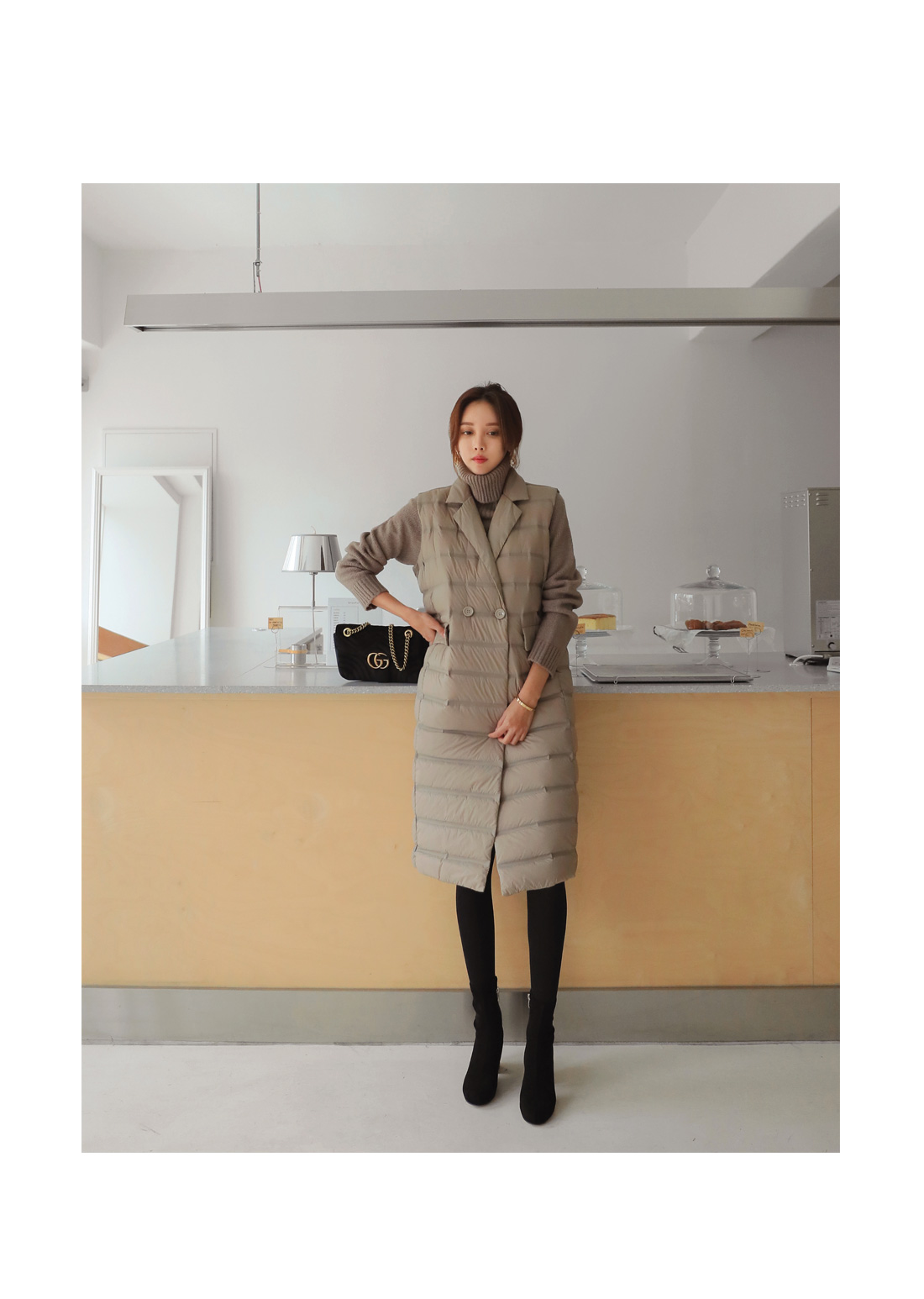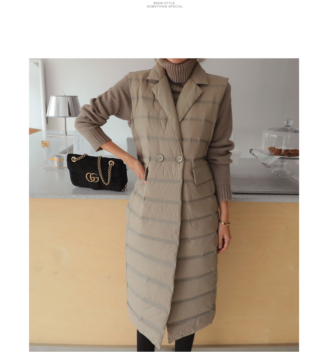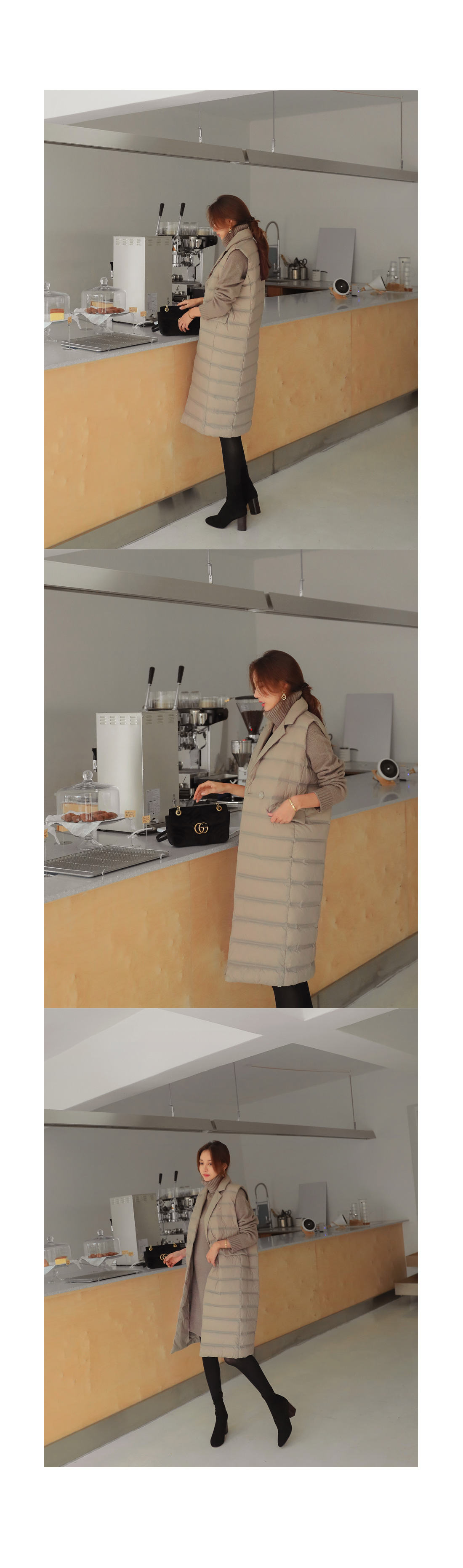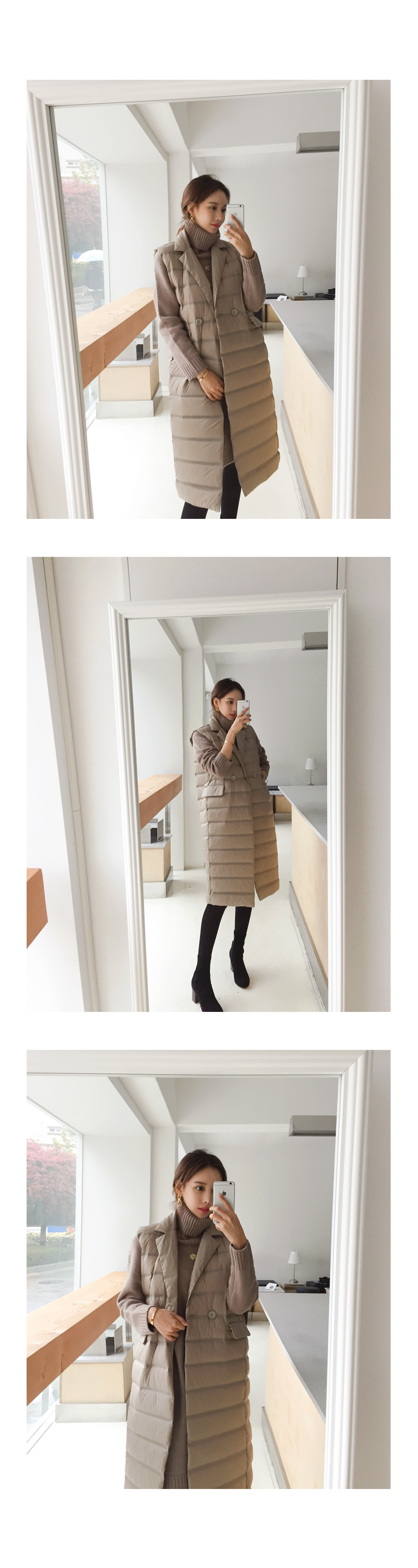 MD COMMENT 오리털100% 충전재로깃털처럼 가벼우면서 따뜻한 착용감을 느낄 수 있는"경량카라조끼패딩"을 소개해드릴게요여성스러운 무드가 느껴지는 디자인으로 고급스러운 느낌을 주면서 일자로 툭 떨어지는 실루엣이구요 네크라인이 허전해 보이지 않게카라넥으로 포인트를 주면서 허리 옆쪽으로 볼드하게 라인을 주어더 슬림하면서 길어보이게 연출해준답니다 롱한 기장감으로 체형커버 효과를 주면서 간절기에는 아우터로-한겨울에는 핸드메이드 코트안에 레이어드해서 입을수 있는 너무 부하지않은 디자인으로 활용도 높은 롱조끼에요 솜털 90%의 높은 함유량으로 초경량라이트다룬처럼 가볍지만 보온성이 좋구요-!디자인과 퀄리티가 좋은 아이템이라 소장 적극 추천드려요-!COLOR/SIZE 베이지,블랙FREEMODEL FITTING 베이지/FREE
