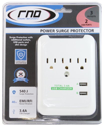 RND Power Solutions slim charging station boasts three outlets and 2 USB ports and now has more amps than ever. This charger allows you to charge your laptop cell phone camera USB powered tablet and MP3 players all from a single power outlet so all of your digital devices are in one convenient location. RND Power Solutions charging station features a 2-port hub capable of charging 2 USB-powered devices at the same time with a total of 3.4 amps you can quickly charge iPads and tablets. RND Power Solutions charging station also has built-in protection against power spikes protecting your devices from overheating. RND Power Solutions charging station securely mounts to any three prong outlet. Compatible With but NOT limited to: Apple iPad Air Apple iPad mini Apple iPhone 5S Apple iPhone 6 Apple iPhone 6 Plus Apple iPod touch Google Nexus 6 HTC One LG G3Microsoft Lumia Motorola Droid Turbo Motorola Moto G Motorola Moto X Samsung Galaxy Note 3Samsung Galaxy Note 4Samsung Galaxy S4 Samsung Galaxy S5 Sony Xperia